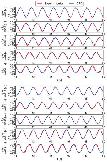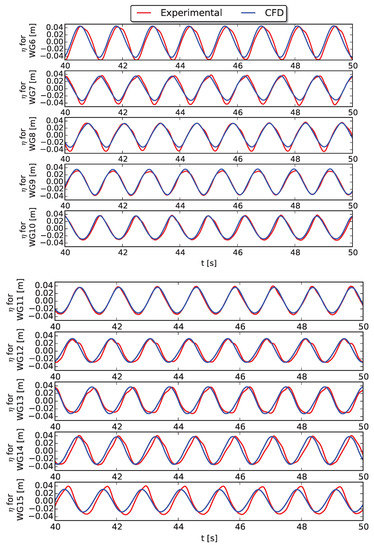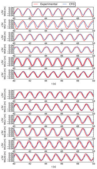 Perturbed wave field using WG6 to WG15 (see Figure 2) around the 5-WEC array with fixed WECs during a regular wave test ( m, s, m) obtained with CFD (blue line) compared to the experimental data (red line).