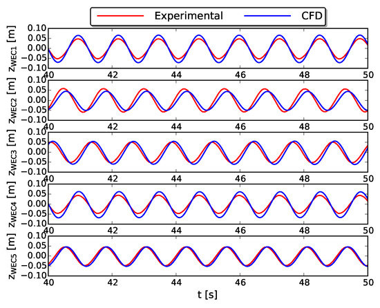 Vertical position of WEC1 (top) to WEC5 (bottom) obtained with CFD (blue line) compared to the experimental heave motions (red line).