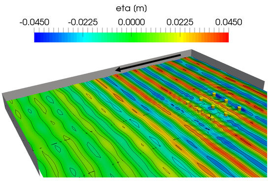 A three dimensional snapshot of the perturbed wave field around the heaving 9-WEC array obtained with CFD at s. The arrow indicates the direction of the incoming waves.