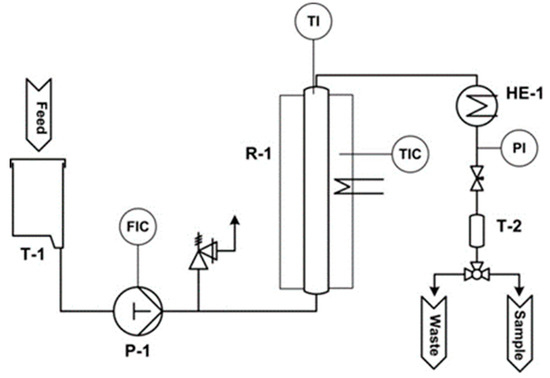 Piping and instrumentationdiagram of test rig. T-1: feedstock tank, P-1: pump, R-1: tubular reactor with surrounding heating block, HE-1: cooler, T-2: small tank.