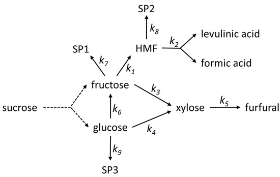In our model, glucose is either isomerized to fructose or converted to noncharacterized side products. Even if acids are far less effective catalysts than bases, enolization and isomerization of sugars occurs [30,31,35,36]. We simply implemented the isomerization of glucose to fructose in our model because in other works [37,38,39], the reverse reaction from fructose to glucose was reported negligible. A pathway from glucose to xylose is also included in the model.