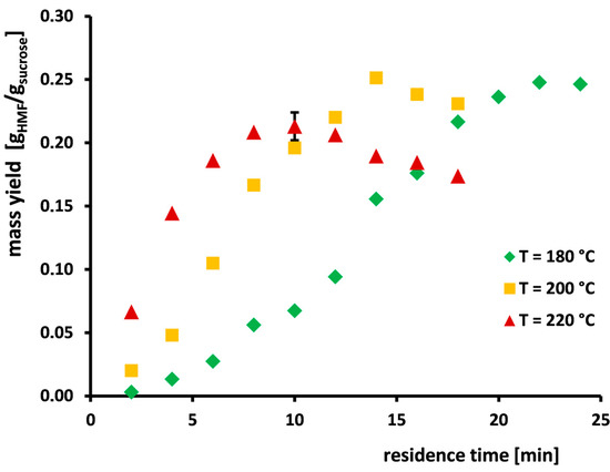 The HMF yield at reaction temperatures of 200 and 220 °C shows a maximum within the residence time spectra investigated (see Figure 3). At 180 °C, the lowest temperature considered, however, the HMF yields increased continuously with reaction time. The highest yields of HMF recorded, based on input sucrose mass, were 0.25 g/g (at 180 °C, 22 min), 0.25 g/g (at 200 °C, 14 min), and 0.23 g/g (at 220 °C, 10 min). We expect that temperatures above 220 °C would result in a lower HMF maximum at shorter residence times.