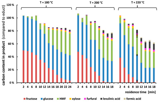 Figure 4 shows the carbon balance of the sucrose conversion at 180, 200, and 220 °C. A carbon balance of over 100% results from measurement errors of the individual components via HPLC. The carbon from sucrose input was mostly transferred during the reaction to glucose, fructose, or HMF for all residence times considered (see Figure 4). Carbon conversion to xylose and furfural was minor, even at the harshest reaction conditions of 220 °C and 18 min. The hydration products of HMF, levulinic acid and formic acid, become more important at higher reaction temperatures. Sucrose was not detected in the samples, and so was completely hydrolyzed even at the lowest residence times. This is in accordance with Bowler et al. [20], who performed sucrose hydrolysis at similar reaction conditions.