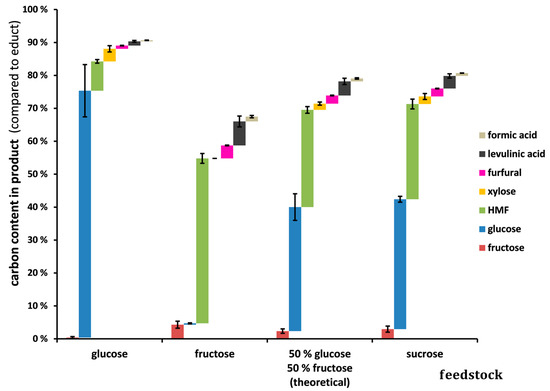 Furthermore, we compared the feedstocks of sucrose, glucose, and fructose concerning their product distribution at 220 °C. The results of glucose and fructose conversion can be used to predict the yields from sucrose conversion.