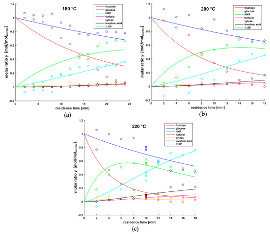We avoided modeling on a molar yield base, because defining the maximal theoretical yield of each component in the sucrose reaction network is not obvious (compare Figure 2). The modeling is, therefore, performed on a molar ratio base (see Equation (1)). The experimentally determined molar ratios of fructose, glucose, HMF, xylose, furfural, levulinic acid, formic acid, and the sum of the side products can be found in Tables S1 and S2 of the Supplementary Material to this article.