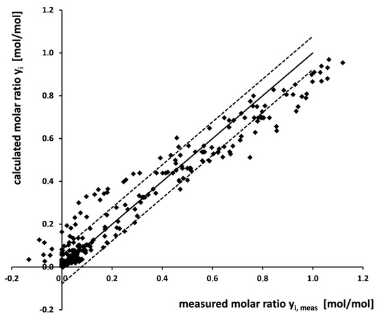 Parity plot of the molar ratio measured yi,meas and the molar ratio calculated yi. The solid line though the origin has a slope of one. The dashed lines have a slope of one and are shifted by the standard derivation.