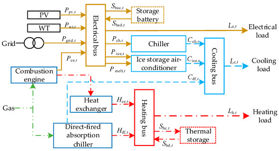 In this paper, we establish the CCHP integrated MEG model based on energy bus [28]. According to the type of energy conversion, energy buses are divided into three types: electrical energy bus, heating energy bus, and cooling energy bus. The devices connecting to the bus are divided into four types: source, converter, energy storage, and load. Energy bus-based structure of CCHP integrated MEG is shown in Figure 1. The figure shows not only the coupling relationships among different devices in detail, but also the conversion relationships between devices and energies. Internal combustion engine, ice-storage air conditioner, energy storage, PV, WT, and other main devices modeling reference to [6,8,9]. Independent modeling of different sources (wind/light/electricity/gas), storages (electrical/thermal/cold), and conversion devices in MEG must satisfy the cooling, heating, and electrical balance equations, and their operation constraints in each t period. The followings are the energy balance equations in MEG.