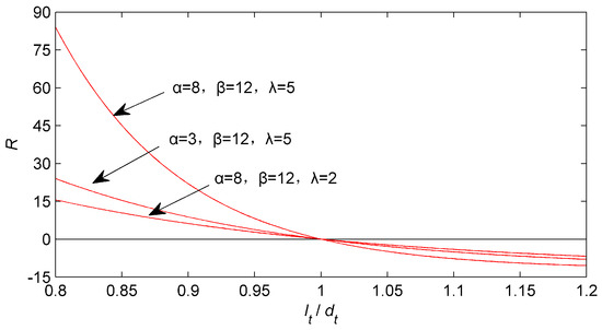 where α > 1, β > 0, λ > 1. Parameter β is the preset value that the function close to when the actual load increases to a certain extent. Parameter λ is related to the proportional elasticity of load adjustment, which makes the adjustment more sensitive. Parameter α is related to the magnitude of the function. dt is the user’s demand load. When taking into account the economy, the user experience of energy usage should also be considered. Therefore, we take the user dissatisfaction as one of the user’s goals. In other words, the user’s actual load is adjusted within a reasonable range, so as not to affect the experience of energy usage. Under the determined demand load dt, with the adjustment of lt, the user dissatisfaction function curves with different parameters are shown in Figure 2.