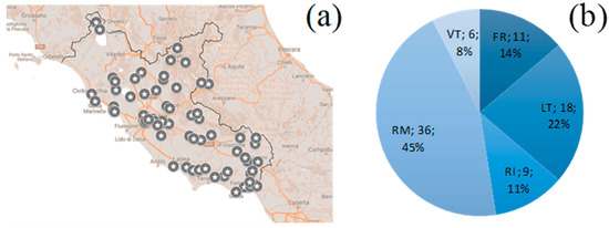 Spatial distribution of the analyzed schools in the Lazio territory: (a) map and (b) number of schools per province (RM = Rome; VT = Viterbo; FR = Frosinone; LT = Latina; RI = Rieti).