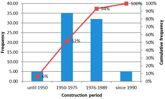 Figure 3 shows that the analyzed buildings were mostly built before 1976 and only a few of them were built in recent years (6%). 1976 is the year of the first publication of an energy law in Italy [29] and from Figure 3 it is possible to notice that 52% of the buildings were built without any energy regulation.