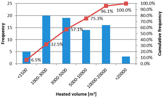 Considering the heating volume of the buildings (Figure 4), 57.1% of them have a volume lower than 5000 m3. Lower volumes occur when the school consists of a single building, or small kindergartens and nursery schools. In the case of more than one building and for comprehensive institutes including both primary and secondary schools, the volumes are bigger. The Italian legislation [30,31] fixed the minimal standards for the number of students per class and for the gross surfaces per student for every typology of school. The Italian Government has significantly tried to reduce the number of small schools, privileging the development of schools in urban areas and in cities with a high density of population. Sometimes the consequences of government action have been the union of two different schools in a comprehensive educational institution. Alternatively, the merge of two schools of the same typology occurred with a reduction of the number of buildings.