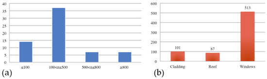 Number of interventions as a function of cost per floor area (€/m2, (a)) and the cost per square meter of the interventions’ surface area (€/m2, (b)).