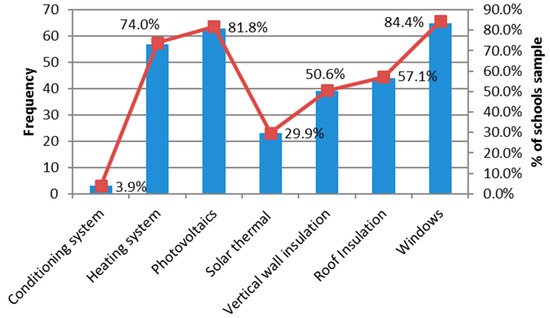 Figure 7 shows the frequency distribution of the kind of interventions proposed in the energy retrofit phase. It is noticeable that the vertical walls insulation interventions represent approximately half (50.6%) of the total ones and that 84.4% of the schools chose to replace windows. Also, the introduction of the photovoltaic system is very common and it has been implemented at a frequency of 81.8% of the sample. The integration of renewable energy sources can also be carried out thanks to the installation of solar thermal systems, but this happens in a lower percentage of the cases (29.9%). Finally, the interventions regarding the plants involve mainly the heating system with a few percentages implemented on the conditioning system. It is worth noticing that the interventions regarding the envelope, the energy systems, and the introduction of renewable energy systems were put in place by almost all the schools with percentages that are respectively 96%, 83%, and 86% of the overall schools considered in the study.