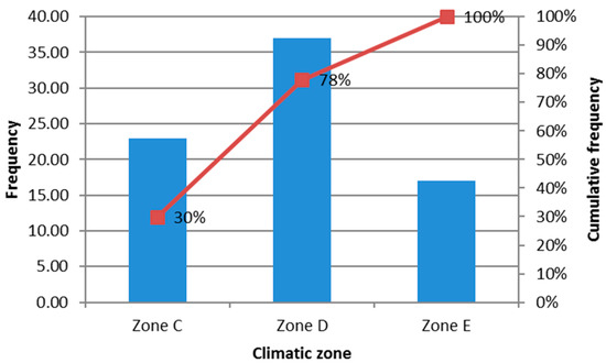 When a comparison of the thermal energy uses has to be done, a normalization of the values of primary energy uses against the climatic conditions is necessary. The buildings included in the sample are located in the different cities and provinces of the Lazio region that are in three different Italian climatic zones, called C, D and E [32]. In particular, 30% of the schools are in climatic zone C, 48% in D, and 22% in E (see Figure 9). The climatic zones define areas with similar mean external temperatures during wintertime and consequently similar HDD. Certain areas in the Lazio region with lower HDD are in climatic zone C, and the areas with higher values are in climatic zone E. The values of the HDD can be easily found for each Italian city and town, as reported in the Italian legislation [33].