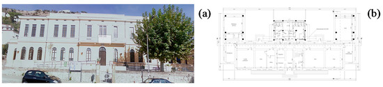 The cluster 1 reference school building (Building 1): (a) actual view; (b) building ground floor map.