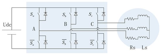 Two-level, three-phase voltage source converter for permanent magnet synchronous motor (PMSM).