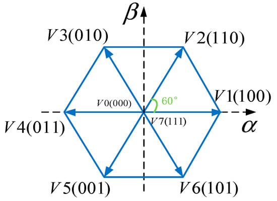 For the two-level voltage source converter (VSC)-fed PMSM system, as shown in Figure 1, the primary voltages , and are determined by the status of the three switches , and . Therefore, there are six active voltage vectors and two zero voltage vectors. The spatial placement of these eight voltage vectors in the α-β stationary reference frame is shown in Figure 2, and they can be expressed as: