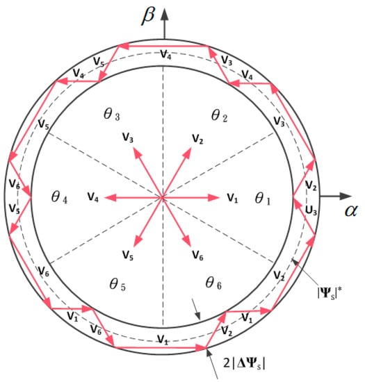 The equation implies that will move in the direction of the applied voltage vector if the stator resistance is neglected. Therefore, the amplitude of stator flux linkage can be increased or decreased by selecting the proper voltage vector. Figure 3 shows how the voltage vectors are selected for keeping within a hysteresis band . There are six independent sectors setting in the whole vector plane (, i = 1–6).