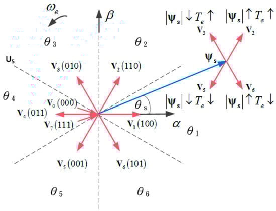 According to above analysis, torque and stator flux can be controlled directly by selecting an appropriate inverter voltage vector to regulate the torque and flux within their respective hysteresis bands. The illustration of the voltage vector’s effects on the stator flux and torque is shown in Figure 4, which the stator flux vector is located at sector 1 and rotates anticlockwise. The voltage vector can increase the torque and stator flux magnitude simultaneously. The voltage vector can reduce both the stator flux magnitude and torque. Applying enlarges the torque but decreases the stator flux magnitude. Similarly, reduces the torque and increases the stator flux magnitude. The similar results can be extended easily for all the other sectors accordingly.
