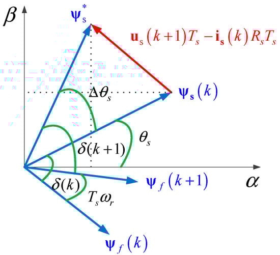 where is the sampling interval. is the required voltage vector that forces flux linkage to reach the reference flux linkage vector at the end of the next sampling interval. Their relationship is shown in Figure 6. Equation (17) can be decomposed in reference frame and are rewritten as: