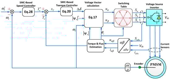 The standard scheme of DTC for PMSM is shown in Figure 5. The torque and stator flux control signals and are generated by torque and flux hysteresis controllers respectively, which are defined as: