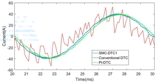 The waveform of the stator phase-A current for different control methods is shown in Figure 11. The total harmonic distortion (THD) of one cycle is 41.9%, 2.63%, and 2.84% with respect to the conventional DTC, PI-DTC and SMC-DTC. Therefore, the SVM technique in PI-DTC and SMC-DTC methods can effectively eliminate harmonic current.