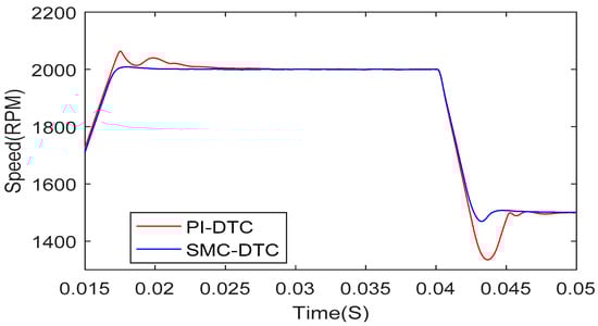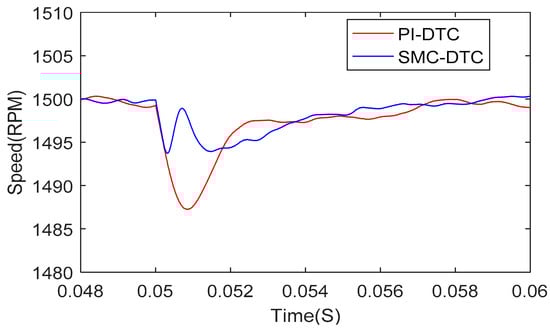 To validate the performance of speed control, the reference speed was maintained at 1500 rpm. The load torque is rising from 0 N·m to 10 N·m at the time of 50 ms. The emulated results of load disturbance rejection properties in two methods are presented in Figure 13. The speed drops are 13 rpm and 6 rpm with respect to the methods of PI-DTC and SMC-DTC. The speed regulation under SMC-DTC method reduce speed drop and enhances robustness against the load disturbances.