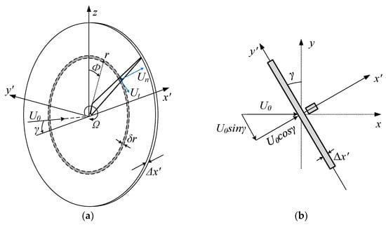 Based on the above assumed wake boundary of , the integration in the above Equation (34) is calculated in the spanwise direction under a polar coordinate system with the origin at the wake center as follows: