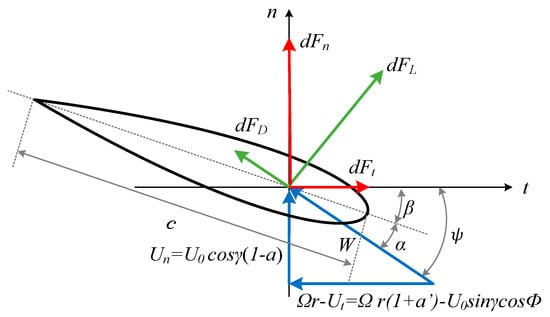 where and are the axial and tangential velocities of the incident flow at the local blade element position. The resulting axial force and tangential force on the blade element can be expressed as:
