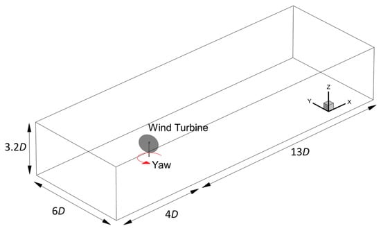where, is the source term in Equation (2) for each direction to present the effects of the turbine rotor on the momentum. The rotor can be rotated around the z axis enabling the yaw angle configuration. The nacelle and tower are modeled as a porous media with the packing density of 99.9%.