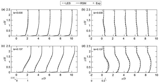 where is the normal Reynolds stress in the streamwise direction. Note that the ambient turbulence intensity is the streamwise turbulence intensity upwind the turbine at the hub height. Figure 4 shows the vertical profiles of mean velocity and turbulence intensity at the several streamwise locations, in which dashed lines denote the LES result by Qian and Ishihara [27], solid lines are the RSM results and experimental profiles at the position of turbine () by Ishihara et al. [18] are also plotted together by the open circles. The quantitative comparison by using the Normalized Root Mean Square Error (NRMSE) [35] for each case are summarized in Table 3, in which the mean values of experimental data are used for the normalization. The RSM result shows good agreement with the LES results and the experimental data.