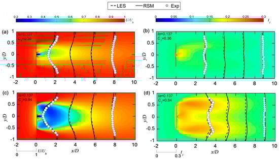 The LES results for the wind turbine wake simulation have been validated with high accuracy by comparison with the experimental data [27]. In order to examine the accuracy of the RSM for wind turbine wake simulation, the mean velocity and turbulence intensity in the wake region under the non-yawed condition are compared with the LES results [27] and experimental data [18] as shown in Figure 5, in which the presented results in contour plots are from RSM. The quantitative comparison by using the NRMSE for each case are summarized in Table 3. The predicted horizontal profiles of mean velocity and turbulence intensity at selected downwind locations by the RSM agree well with the experimental data and show almost same accuracy with LES.