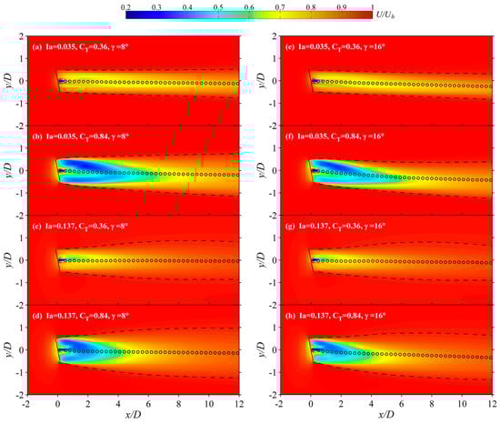 From Figure 6, it is noticed that the wake velocity deficit reduces when the yaw angle increases. This is consistent with Equation (21) since larger yaw angle induces smaller thrust force on the rotor. In addition, the wake center trajectories show apparent wake deflections under yawed conditions. As expected, the wake deflection increases with the increase of yaw angle. It can also be seen that the large thrust coefficient (Case 2, 4, 6, 8) induces stronger wake deflection than the cases with small thrust coefficient (Case 1, 3, 5, 7). The high ambient turbulence intensity (Case 3, 4, 7, 8) leads to smaller wake deflection and shorter wake region than cases with the low ambient turbulence (Case 1, 2, 5, 6) as the cases under the non-yawed condition. The high turbulence accelerates the process of flow mixing in the wake region, thus both wake deflection and velocity deficit recover faster than those with the low ambient turbulence intensity.