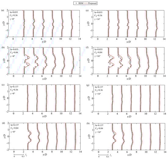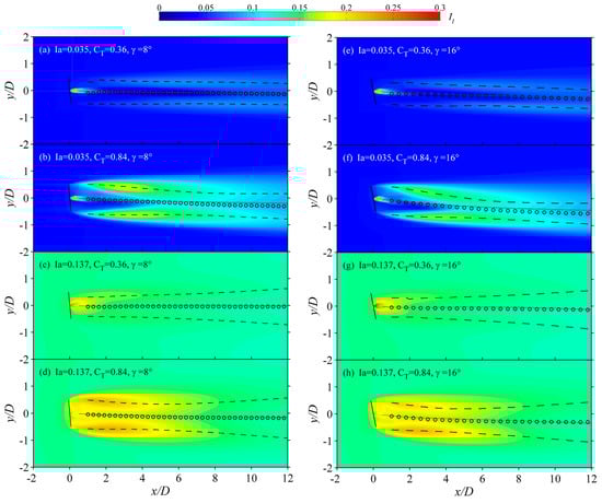 Since the turbulence intensity prediction was not included in the previous wake models proposed by Jimenez et al. [11] and Bastankhah and Porté-Agel [9], only turbulence intensities by the proposed model in this study are plotted for comparison with the numerical results. As shown in Figure 13, the proposed model satisfactorily predicts the turbulence intensity distribution in the wake of yawed turbines. It is noticed that the predicted mean velocity and turbulence intensity distributions in the spanwise direction are assumed symmetric to the wake center trajectory, while the profiles of mean velocity and turbulence intensity from the numerical simulations present slightly skewed shape as shown in Figure 12 and Figure 13.