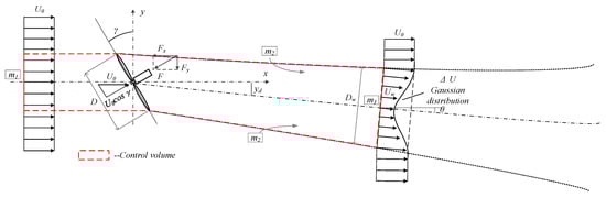 As mentioned above, the wake deflection is induced by the lateral force component, therefore the momentum equation in spanwise direction is analyzed to reveal the relationship between them. The skew angle is assumed to be constant within the assumed wake boundary. Then by equating Equations (25) and (29) and taking the approximation of , the expression of skew angle is obtained as:
