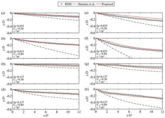 The parameters used in the wake model proposed by Qian and Ishihara [27] are shown in Appendix C. Figure 11 shows the wake deflections under the different conditions, in which the open circles denote the numerical results. The predicted values by Jimenez’s model and the proposed model are plotted by black dashed lines and red solid lines, respectively. The model of Bastankhah and Porté-Agel is not plotted since the parameters and have not been specified. It is noticed that the proposed model shows good agreement with the numerical results, however, the Jiménez’s model overestimates the deflections especially for the cases with the large thrust coefficients. In addition, it is clearly observed that the wake deflections increase almost linearly in the near wake region and then grow slowly in the far wake region. The slopes, i.e., wake skew angles are almost same for the cases with the same and under the same yaw angles. This justifies that Equations (41) and (42) are suitable for the initial wake deflection prediction by assuming a constant initial skew angle which just depends on the and the yaw angle . The high ambient turbulence generally decreases the length of potential core region and accelerates the flow mixing in the far wake region, whereby the wake deflections decrease. It can be inferred that the yaw control strategy is more efficient under low ambient turbulence such as in offshore wind farms.