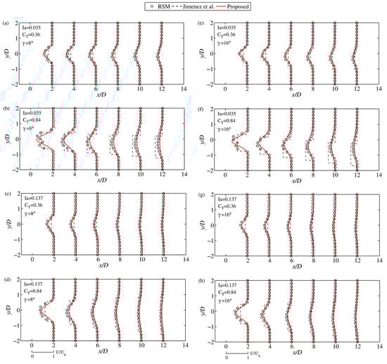 As shown in Figure 12, the proposed model gives more accurate predictions for the mean velocity distributions under the different yawed conditions than those by the top-hat shape used in the Jimenez’s model, which underestimates the velocity deficit in the center of the wake and overestimates them in the outside regions.