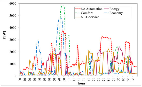 As an example of the operation of the above-described control logics, Figure 1 shows the daily power profiles for a typical summer day in an apartment in Palermo (South Italy), characterized by the loads presented in Table 2. The graphs in Figure 1 clearly show how the control logics are able to substantially modify the load profile of the apartment.