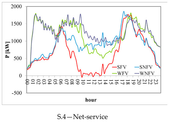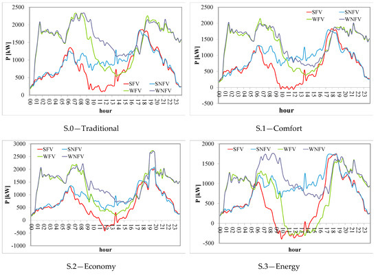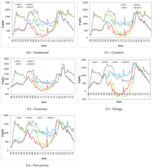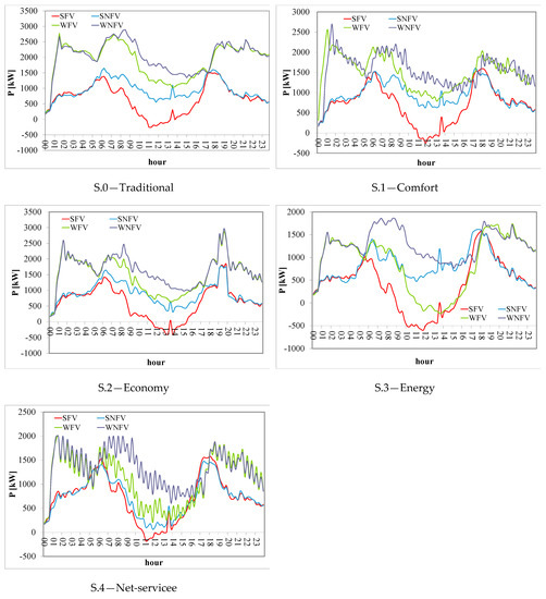 Figure 3, Figure 4 and Figure 5 represent the daily load diagrams of one of the primary substations for a typical summer (S) and winter (W) day, both in the presence (FV) and in the absence (NFV) of photovoltaic generators. To simplify the study, spring and autumn have not been evaluated, considering that the proposed control logics mainly act on the air-conditioning system of the house, not used during intermediate seasons.