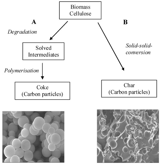 Hydrothermal carbonization (HTC) has found an increasing interest, mainly in view of the opportunities to produce advanced carbon materials [1,2,3,4,5]. On the other hand, knowledge is still missing concerning the processes that happen during hydrothermal carbonization. Two main reaction pathways are likely to occur: on the one hand hydrolysis of the starting material followed by water elimination and consecutive polymerization to “coke”. Hydroxymethylfurfural (HMF) obtained from hexoses and furfural from pentoses are the most important intermediates forming the carbon-rich material. Usually, if only this reaction pathway A (Figure 1) occurs, micro spheres are formed (see scanning electron microscope (SEM) picture left in Figure 1). In Figure 1 this carbon-rich material is typically called “coke”, because of its formation via polymerization like coke in high-temperature dry conversions. On the other hand, the second pathway B (Figure 1) is a solid-to-solid conversion similar to charring phenomena found in dry conversions (mainly at low-temperature) [6,7]. The product of HTC, however it is formed, is usually called hydrochar.