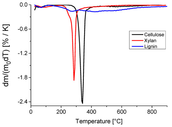 Concerning the structure of biomass or hydrochar, TGA and IR analysis gives more information. Figure 3 shows the DTG curve (DTG: Differential thermogravimetry = first derivative of the TG/TGA curve) of pure cellulose, xylan as model compound for hemicelluloses and lignin. They present the main components of biomass. Xylan has the lowest thermal stability [17]. Cellulose also shows a sharp and significant peak like xylan, but at higher temperature [17]. The extent of the weight loss at a certain temperature is a direct consequence of the uniform type of chemical bonds connecting the sugar monomers to the polymeric carbohydrate. Xylan, or hemicellulose, is a branched polymer, cellulose not. As consequence, cellulose is partly crystallized, and the single polymers strains stabilized each other by hydrogen bonds. Lignin consists of different type of bonds with different thermal stability. As a consequence, lignin degrades in a wide range of temperatures therefore giving no clear peak in the DTG curve [17,20].