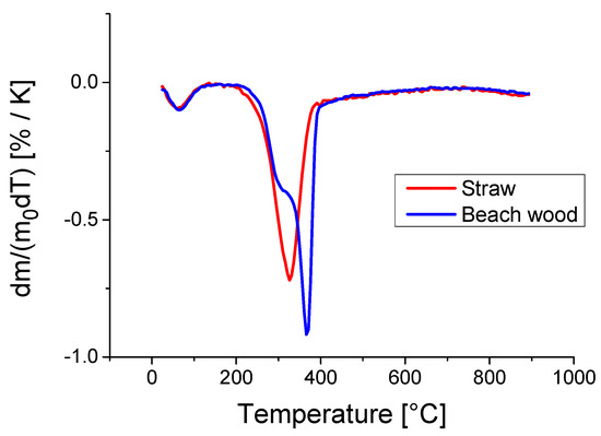 The lignocellulosic materials wheat straw and beach wood consist of hemicellulose, cellulose, and lignin (Figure 2). Figure 4 shows the DTG curves of these two biomasses. Beach wood shows a characteristic cellulose peak with a shoulder, caused by hemicellulose. In the case of straw, cellulose and hemicellulose peaks coalesce to one broader one. This indicates that the structure is different, causes by differing interconnections within the material (Figure 2).