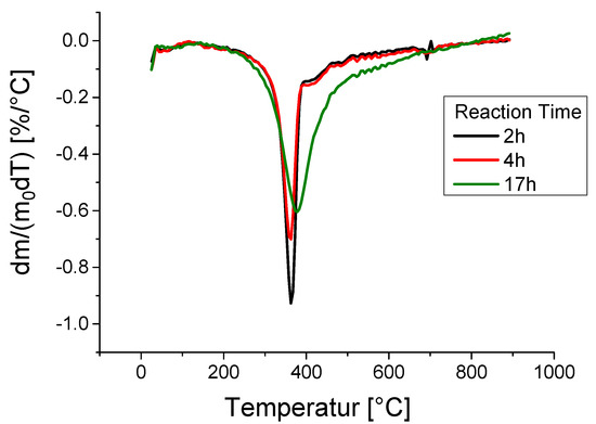 Figure 5 shows the DTG curves of hydrochar produced by the HTC of beech wood at different reactions times and performed at 220 °C carbonization temperature, bearing some resemblance with data from the literature [9]. There is no hemicellulose peak or even shoulder any more. This reminds of DTG curves recorded during “dry” torrefactions: The hemicellulose as the most reactive component is carbonized at the lowest temperature [22]. The cellulose peak is still visible but decreases with the reaction time. Compared to the biomass results (Figure 4), a small peak at around 420 °C is detected after HTC (Figure 5). This weight loss can be tentatively attributed to intermediary carbonization products, like short-chained polymers. As shown in Figure 1, hydrochar is likely to be formed via polymerization of solved molecules. After 17 h reaction (Figure 5), the residual cellulose peak and the peak or the carbonization product seems to have merged.