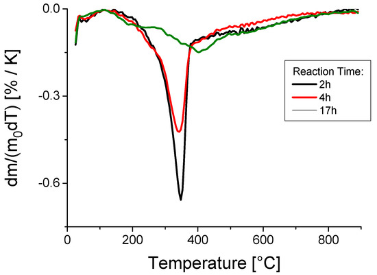 Figure 6 shows the DTG curve of hydrochar from straw produced at 220 °C and different reaction times. Compared to the DTG curve of the non-carbonized biomass (Figure 4), the peak is shifted, because of the conversion of hemicellulose via carbonization. This degradation of hemicellulose as the first biomass compound is in accordance with other studies [23]. The hydrochar from straw (Figure 6) shows lower residual cellulose peaks at 2 h and 4 h reaction times, compared with the hydrochar from wood (Figure 5). In the case of straw hydrochar (Figure 6) and after 17 h reaction time, no “cellulose peak” is visible. Instead, the peak attributed to a carbonization product/short polymer emerged at around 420 °C. The results here are similar to studies with sugarcane bagasse [24]. The “lignin-like” behavior of hydrochars, e.g., in TGA studies, is mentioned by several authors, e.g., [25]. The results indicate that in the case of straw the shielding effect of lignin against hydrolysis is weaker than for wood.