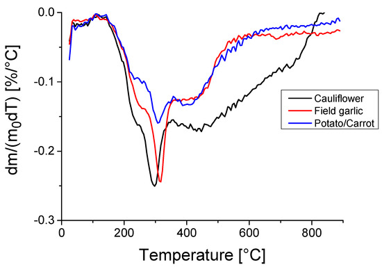 DTG of hydrochar cauliflower, field garlic and potato/carrot mixture (220 °C, 10% dry mass, 4 h). (Modified from [21]).