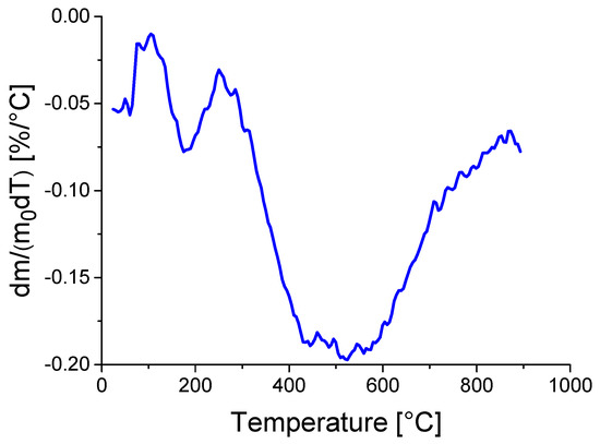 The DTG comparison of beech wood and straw post-treated hydrochars shows a peak at 700 °C for beech wood (Figure 13). This is typical for beech wood lignin [22]. In general, the DTG curves of the post-treated hydrochars are similar to that recorded for lignin (Figure 3).