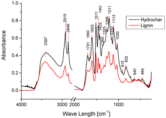 IR spectra of lignin and its hydrochar (10% DM, 220 °C, 4 h). (Modified from [21]).