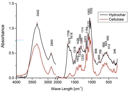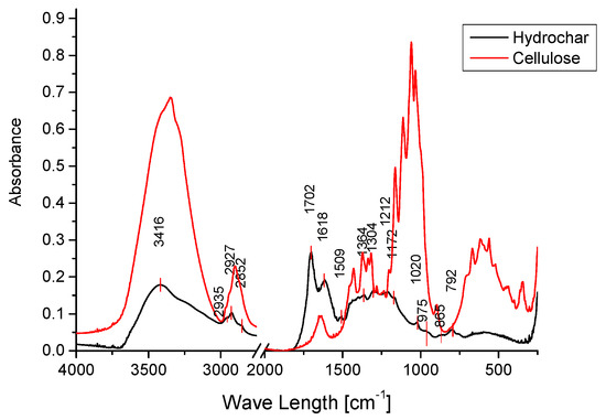 IR spectra of cellulose and its hydrochar (10% DM, 220 °C, and 2 h). (Modified from [21]).