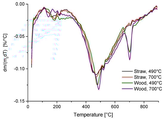 The hydrochars from straw and beech wood, produced at 220 °C, 4 h reaction time and 10% dry mass, are post-treated in a nitrogen flow at 490 °C and 700 °C, respectively. The DTG curves of the post-treated hydrochars are shown in Figure 13. They are very similar for the different post-treatment temperatures. The cellulose peak is gone, in agreement with other studies showing that thermal treatment of different hydrochars or biomass actually levels the final characteristics of the hydrochars [29].