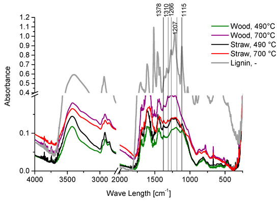 FTIR spectra of thermal post-treated hydrochar from beech wood and straw. Post-treatment temperatures were 490 and 700 °C. For comparison, the spectrum of a not post-treated hydrochar from lignin is added (HTC: 220 °C, 4 h, 10% DM). (Modified from [21]).